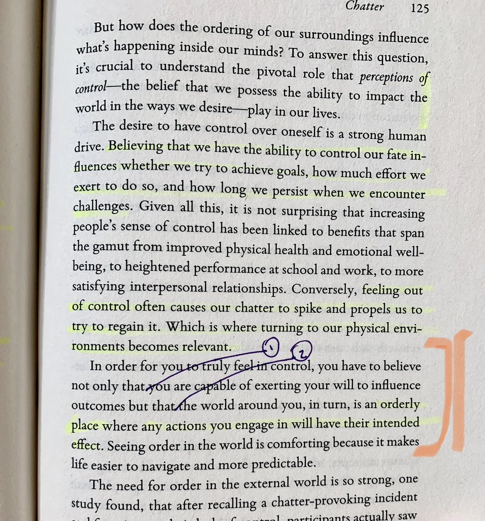 "In order for you to truly feel in control, you have to believe not only that you are capable of exerting your will to influence outcomes but that the world around you, in turn, is an orderly place where any actions you engage in will have their intended effect. Seeing order in the world is comforting because it makes life easier to navigate and more predictable."